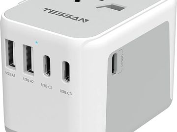 This is my go-to plug for international travel—one adapter, and you're covered in over 150 countries. It has 3 USB-C ports, 2 USB-A ports, and works in Europe, the UK, Australia, and more. I love that it charges multiple devices at once (perfect for phones, tablets, and more) without needing a pile of bricks and cords. Compact, powerful, and travel-tested!